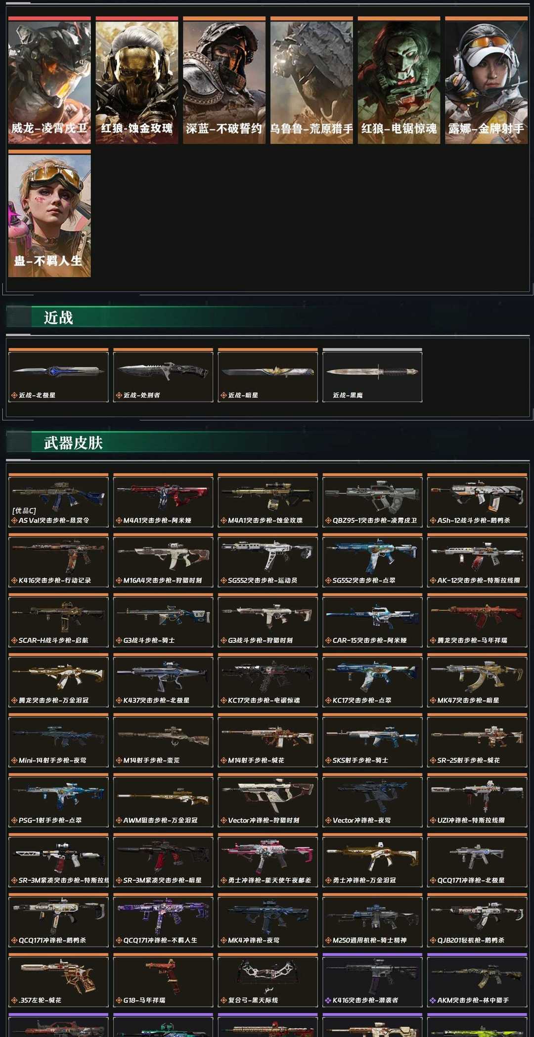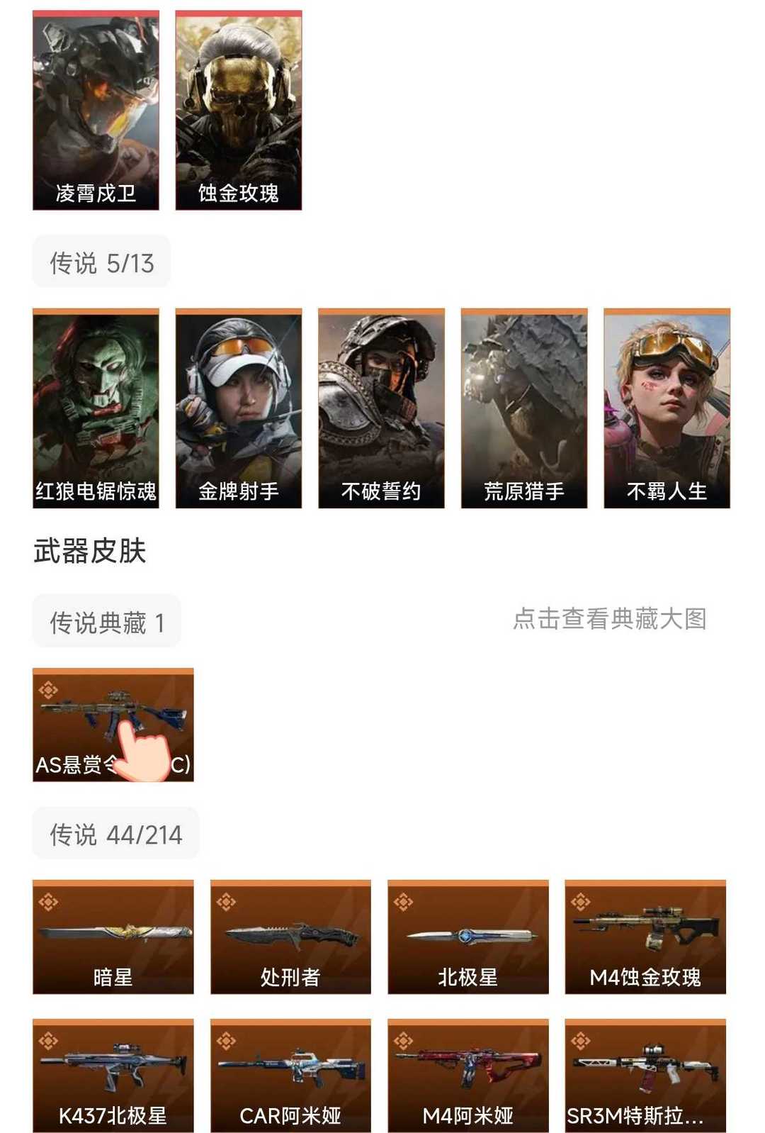 皮肤号 as典藏暗星北极星,凌霄戍卫,蚀金玫瑰,44款传说枪皮