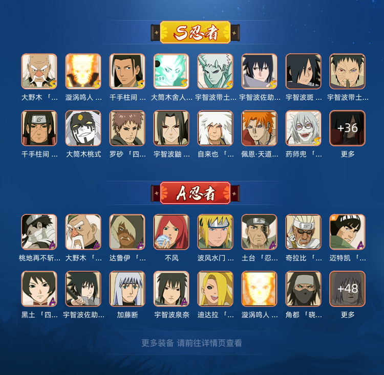 装备描述:52个S忍 62个A忍 忍法帖全齐,所有高招忍者全齐 战力马上3000w 有熊猫 觉得账号不错的可以点个收藏哦,防止下次找不到了